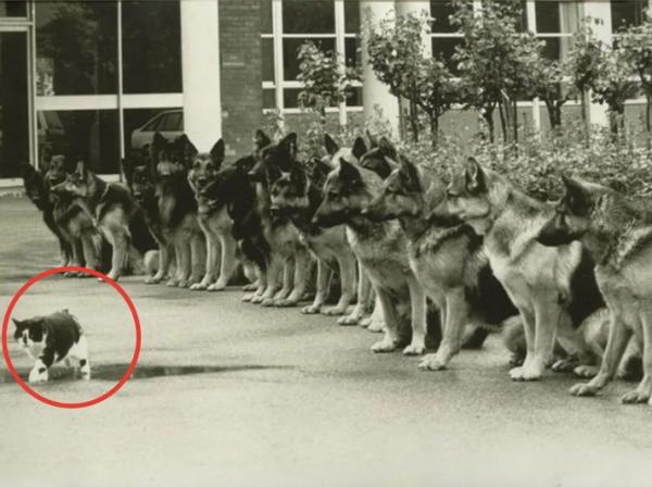 Куча серьёзных здоровых овчарок, перед которыми вальяжно прогуливается кот. Казалось бы, что может пойти не так? Фотография с этой сценой уже пару лет как гуляет по интернету с подписью "Экзамен немецких полицейских собак на выдержку". И ведь люди верят!