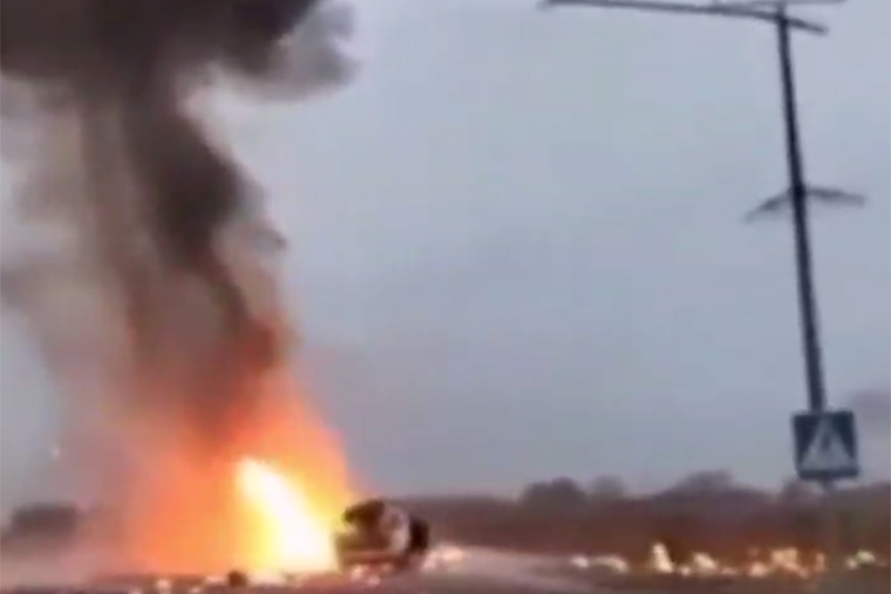 Один солдат упал на асфальт, чтобы избежать удара взрывной волны и осколков. В результате дрон уничтожил пикап, на который было установлено зенитное орудие. А расчету ПВО на этот раз повезло.