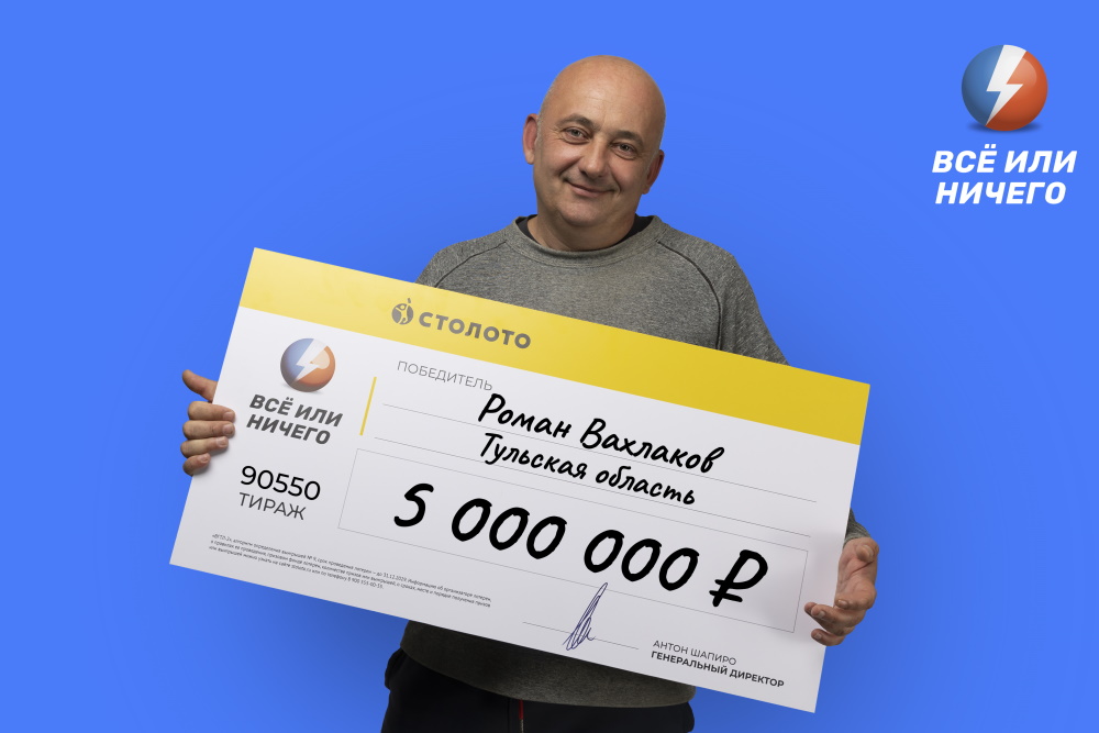 В Тульской области местный житель стал обладателем суперприза в размере пяти миллионов рублей, выиграв в лотерею «Всё или ничего», сообщает «Столото».