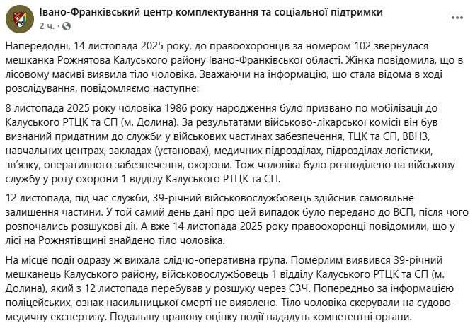 Согласно официальной информации, мужчина 1986 года рождения был призван 8 ноября и направлен в охранную роту Калушского грайонного территориального центра комплектования. По данным ТЦК, 12 ноября он самовольно покинул часть, после чего были начаты поисковые мероприятия.