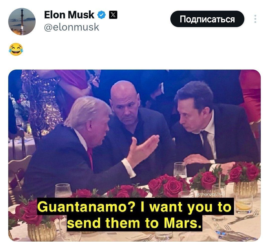 📸 «Гуантанамо*? Я хочу, чтобы ты отправил их на Марс!» — поделился Илон Маск очередным мемом с Дональдом Трампом в социальной сети Х.