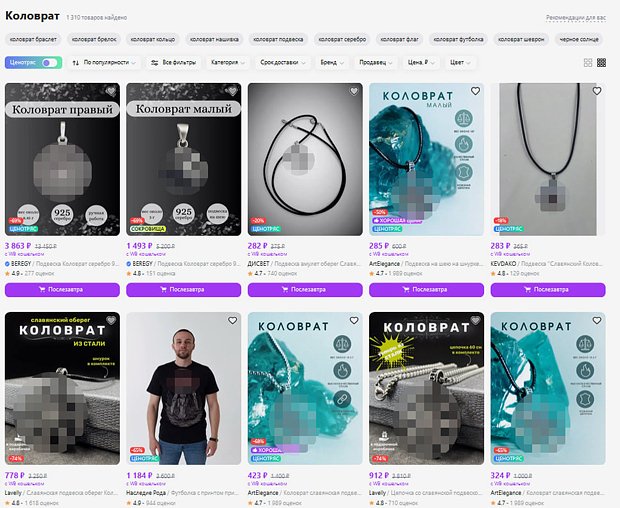 Легко найти на площадке символику с «цветком папоротника», состоящим из четырех незавершенных свастик, образующих одну завершенную; пояса, украшенные теми же рунами «зиг», что и на петлицах бойцов СС (в объявлении указано, что узор называется «перуница»), а товаров с коловратом, который в пункте 947 Федерального списка экстремистских материалов упоминается как символика, «схожая с нацистской до степени смешения», на маркетплейсе насчитывается более 1300 единиц.