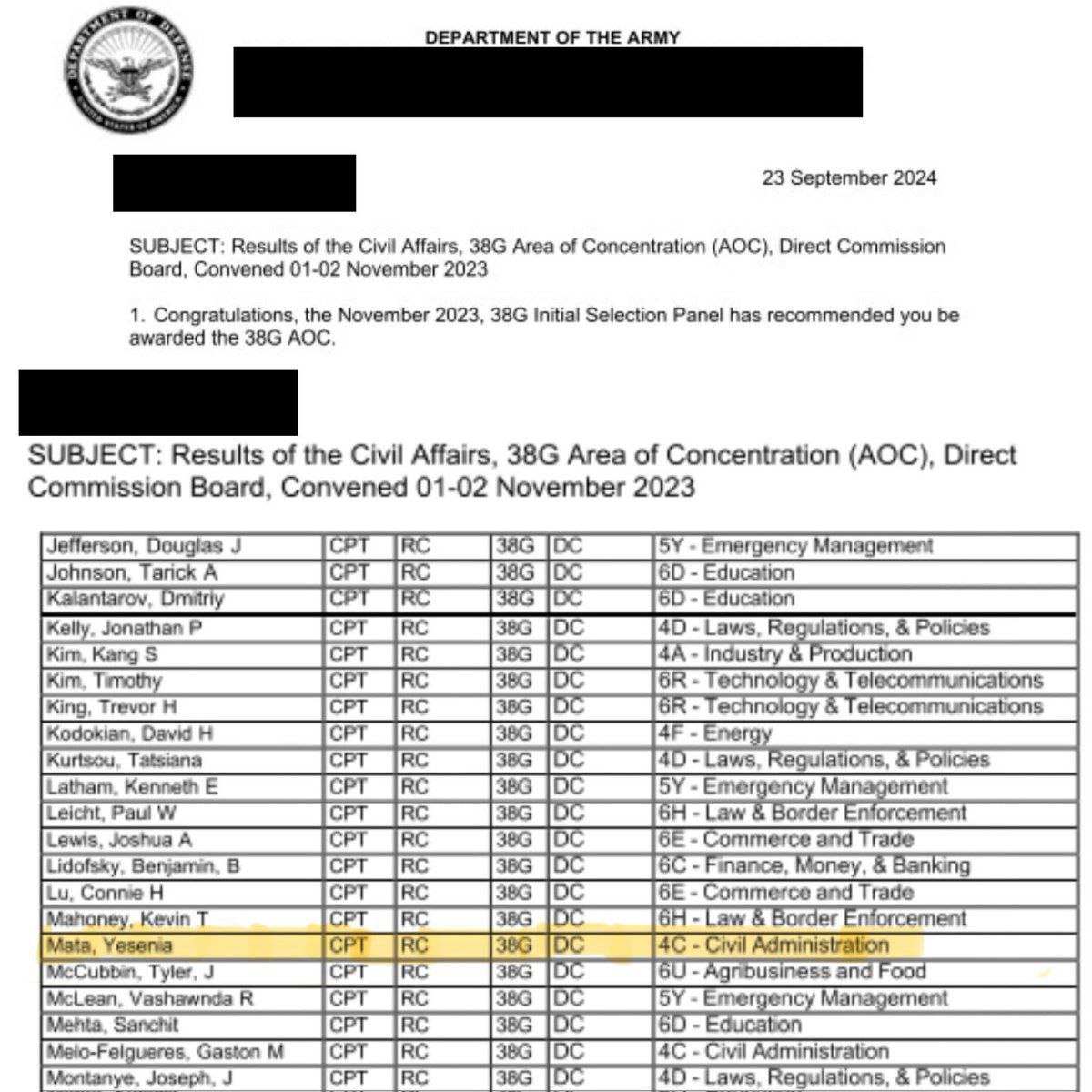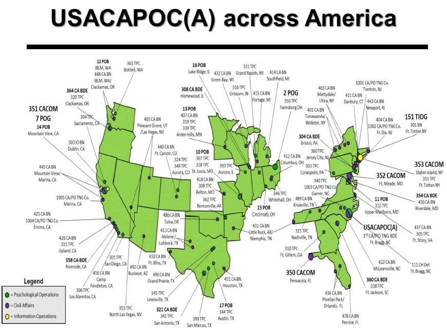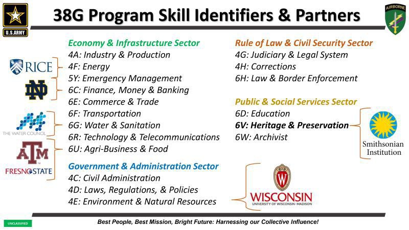 Командование USACAPOC армии США, которое отвечает за связи с гражданской администрацией и проведение психологических операций, провело набор экспертов в области управления, экономики, верховенства права, социальных и государственных услуг для прохождения службы по ВУС 38G «Специалист по военному управлению».