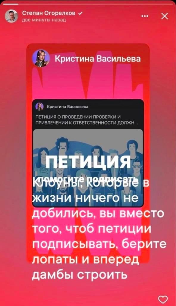 Речь идет о работнике правительства Омской области Степане Огорелкове. Он репостнул в сторис петицию жителей затопленного Усть-Ишимского района, которую выложила фотограф Кристина Васильева.