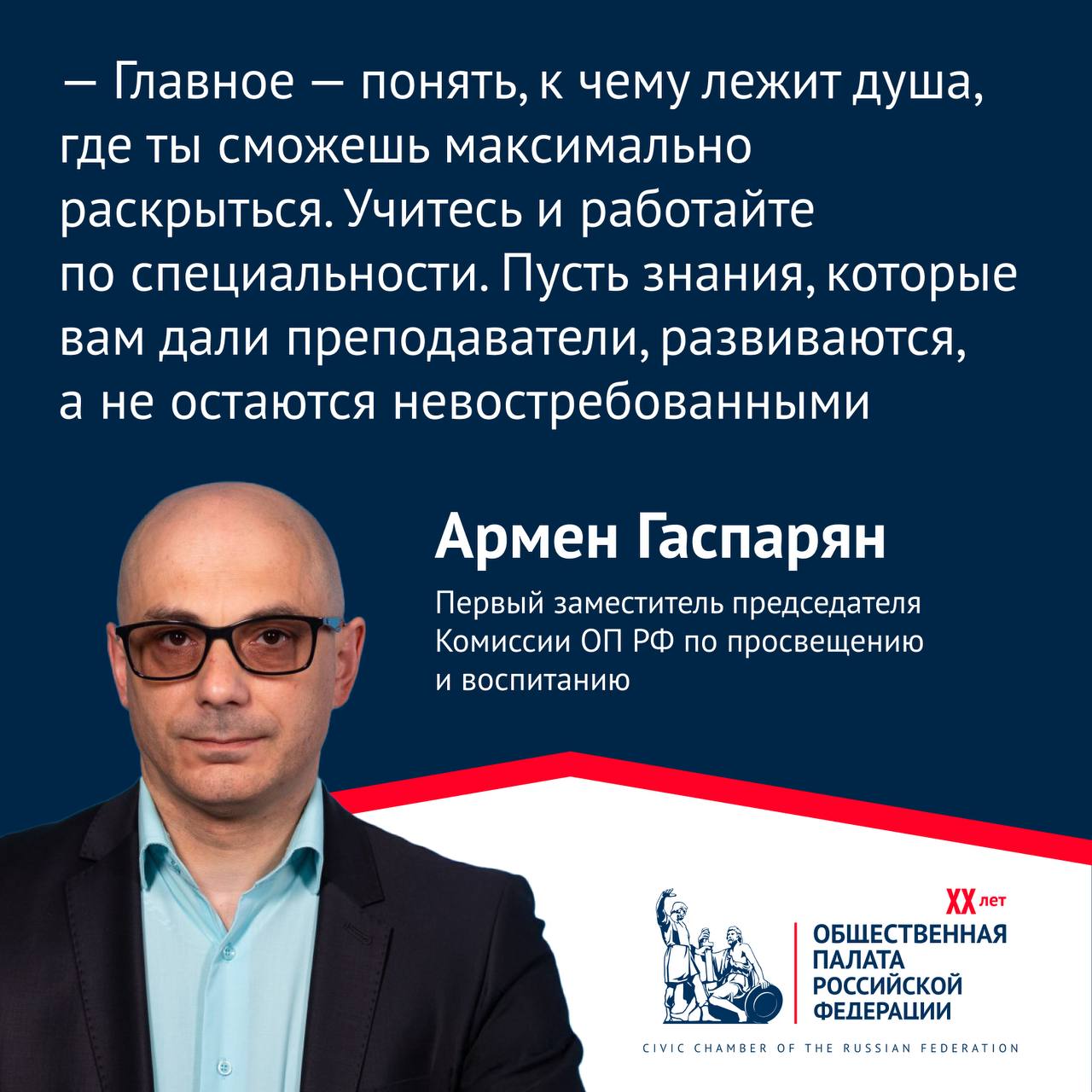 В год 20-летия ОП РФ общественники продолжают делиться своим опытом и знаниями с молодым поколением. В эти дни подачи документов в приемные комиссии вузов и колледжей, считают члены Палаты, особое внимание должно уделяться вчерашним выпускникам, ныне — абитуриентам. Ведь поступление в вуз или колледж — один из важнейших этапов в жизни, когда ответственный выбор будущей профессии во многом определяет дальнейшую судьбу.