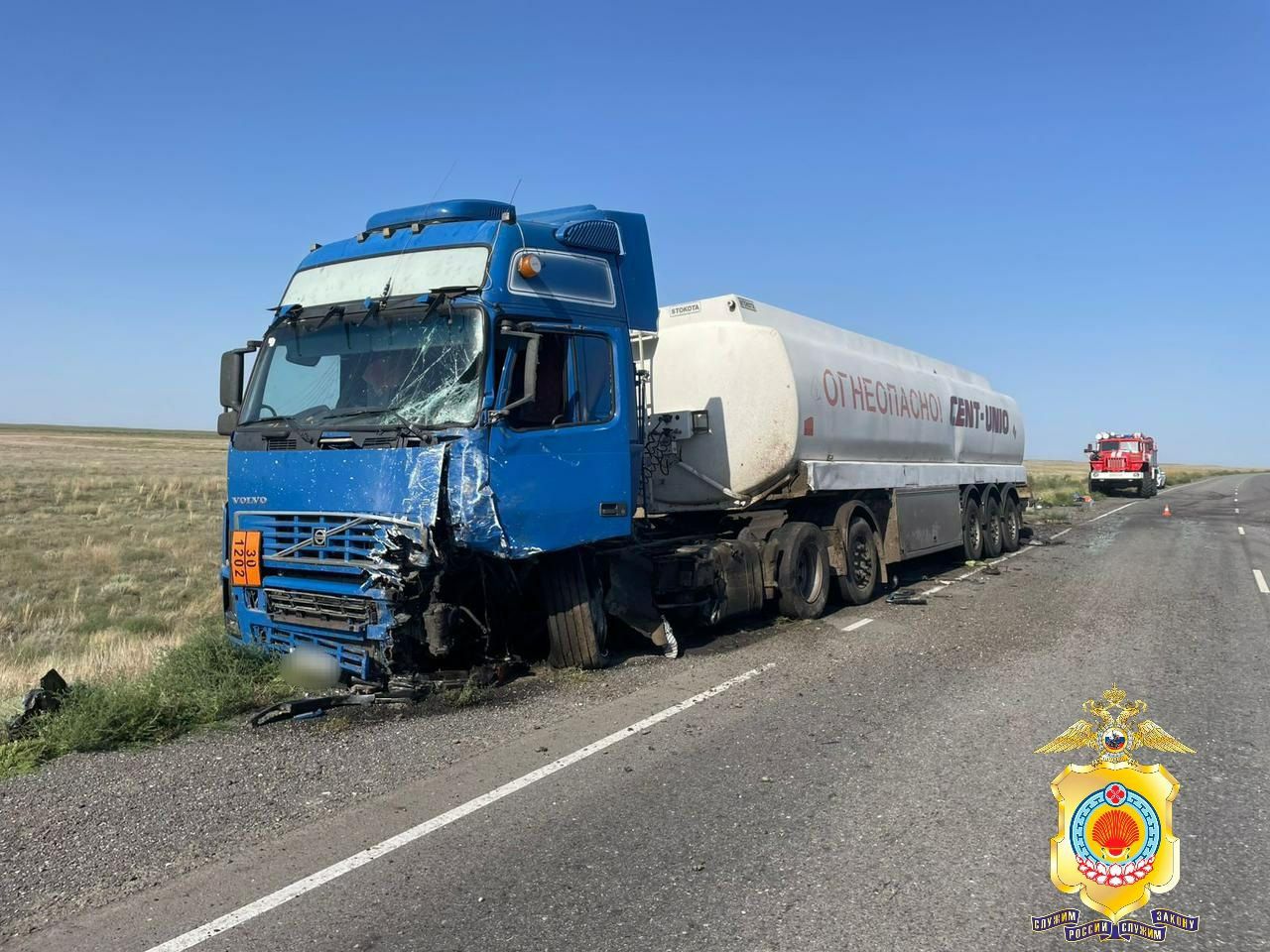 Авария произошла в субботу утром на 145-м километре автодороги "Яшкуль - Комсомольский - Артезиан". Столкнулись Toyota Land Cruiser Prado и бензовоз Volvo.