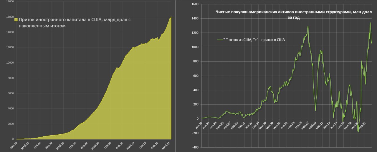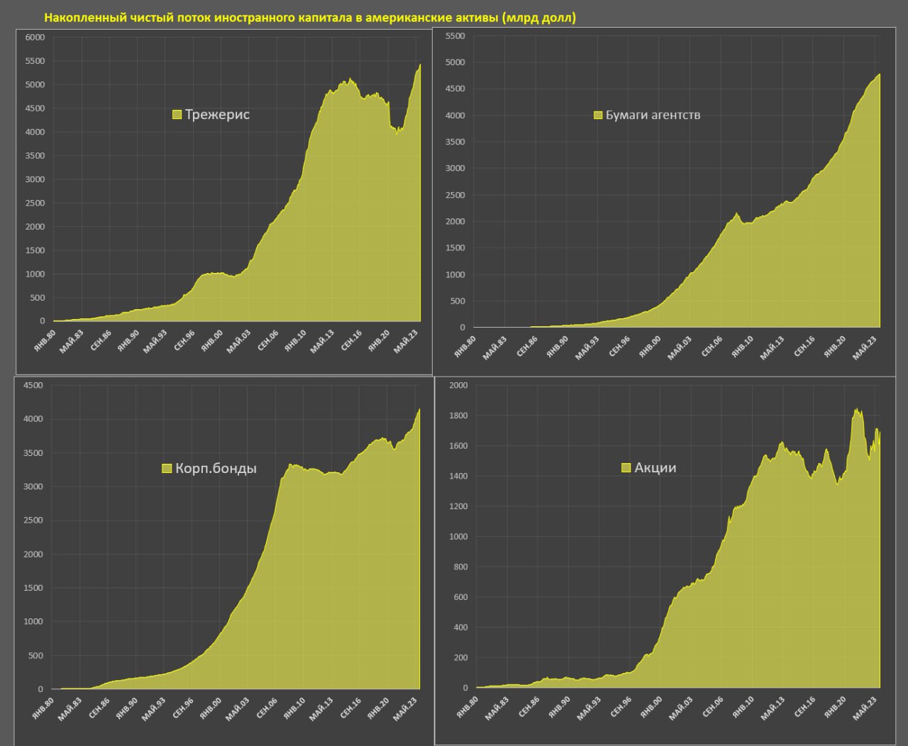 За 2023 год чистый накопленный приток иностранного капитала во все долларовые активы, за исключением денежных, составил рекордные $1.1 трлн по собственным расчетам на основе отчета TIC Минфина США – это повторение прошлых рекордных показателей в 2006 – $1.1 трлн и в 2007 – $1 трлн.