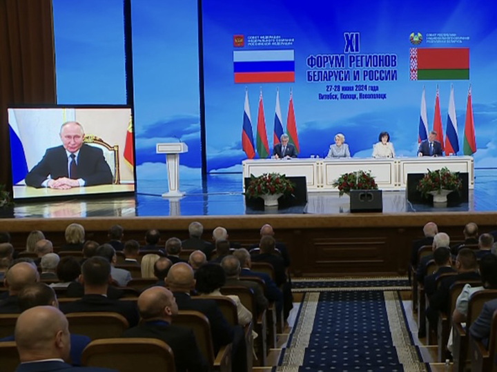 Встречи в таком формате стали по-настоящему доброй традицией, отметил Владимир Путин. Сам российский лидер, как и его белорусский коллега, ограничились видеообращениями к участникам Форума регионов, который в этом году принимает Беларусь.