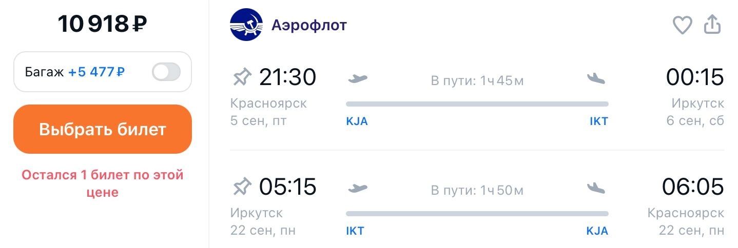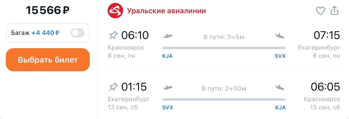 Авиабилетами туда и обратно по таким ценам поделились в телеграм-канале аэропорта Красноярск. Например, со 8 по 13 сентября можно улететь в Екатеринбург— за 15 566 рублей.
