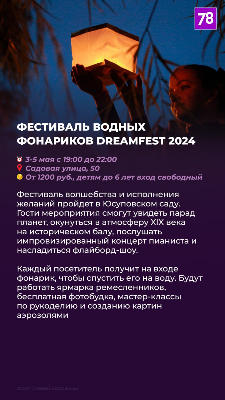 До 12 мая запланировано множество увлекательных мероприятий. В российский прокат выходит научно-фантастический фильм, в Юсуповском саду пройдет самый романтичный фестиваль фонариков, а для любителей современного искусства открылось сразу несколько новых выставок.