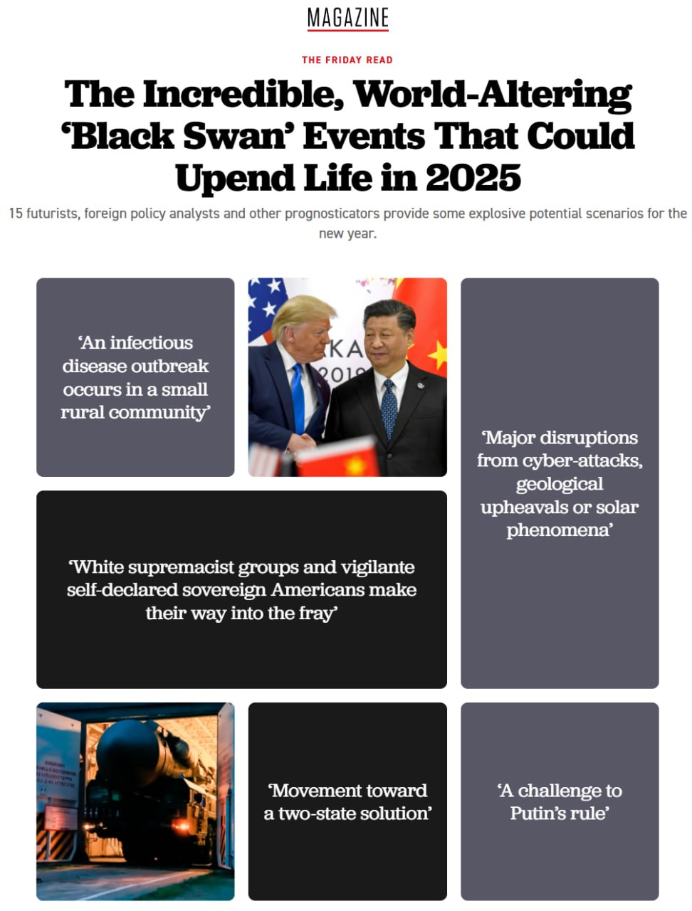 Крупнейшая кибератака в истории, масштабная эпидемия и обвал рынка: Politico опубликовало список «чёрных лебедей» — непредсказуемых и маловероятных событий, которые, по мнению учёных, футуристов и аналитиков, могут произойти в 2025 году