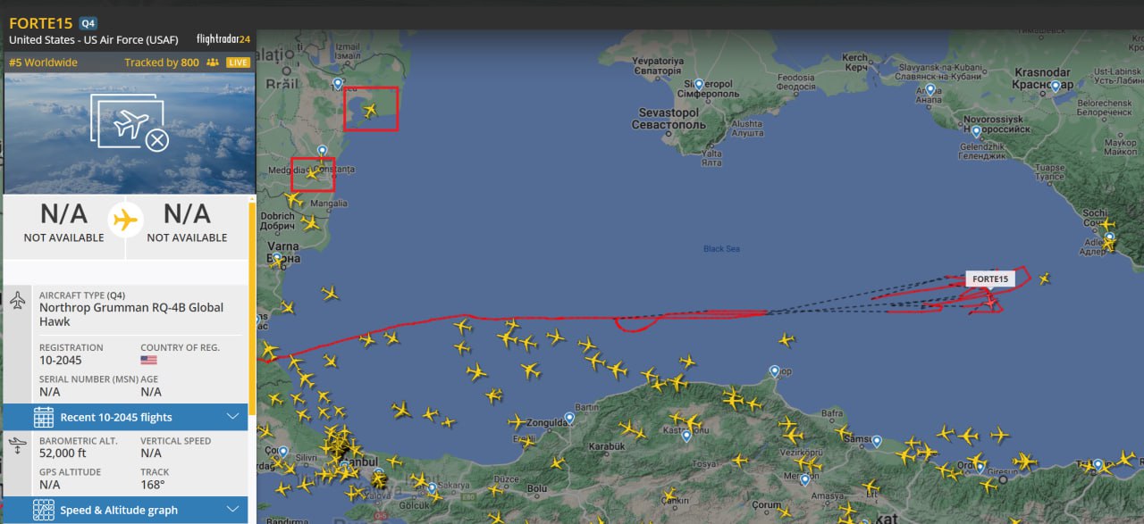 Американский разведывательный БПЛА RQ-4B Global Hawk (позывной FORTE15) сегодня работает с максимальным приближением к российскому побережью в районе Сочи.