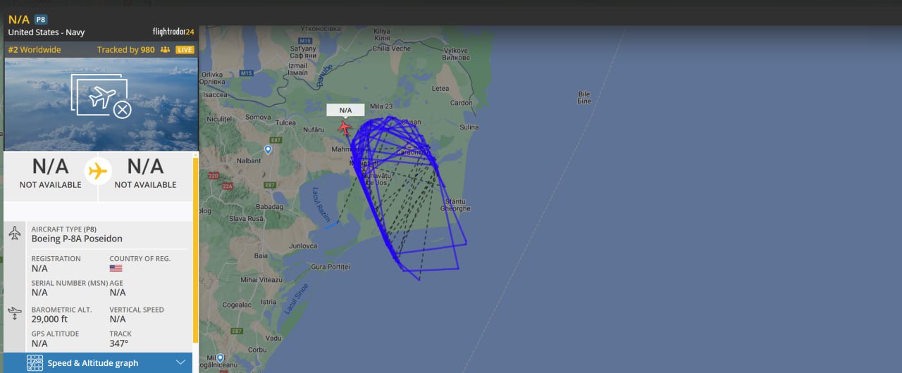 Противолодочный Poseidon — на своём стандартном месте, у румынского побережья в 30 км от границы с Украиной. Чуть южнее также присутствует вертолёт ВВС Румынии.