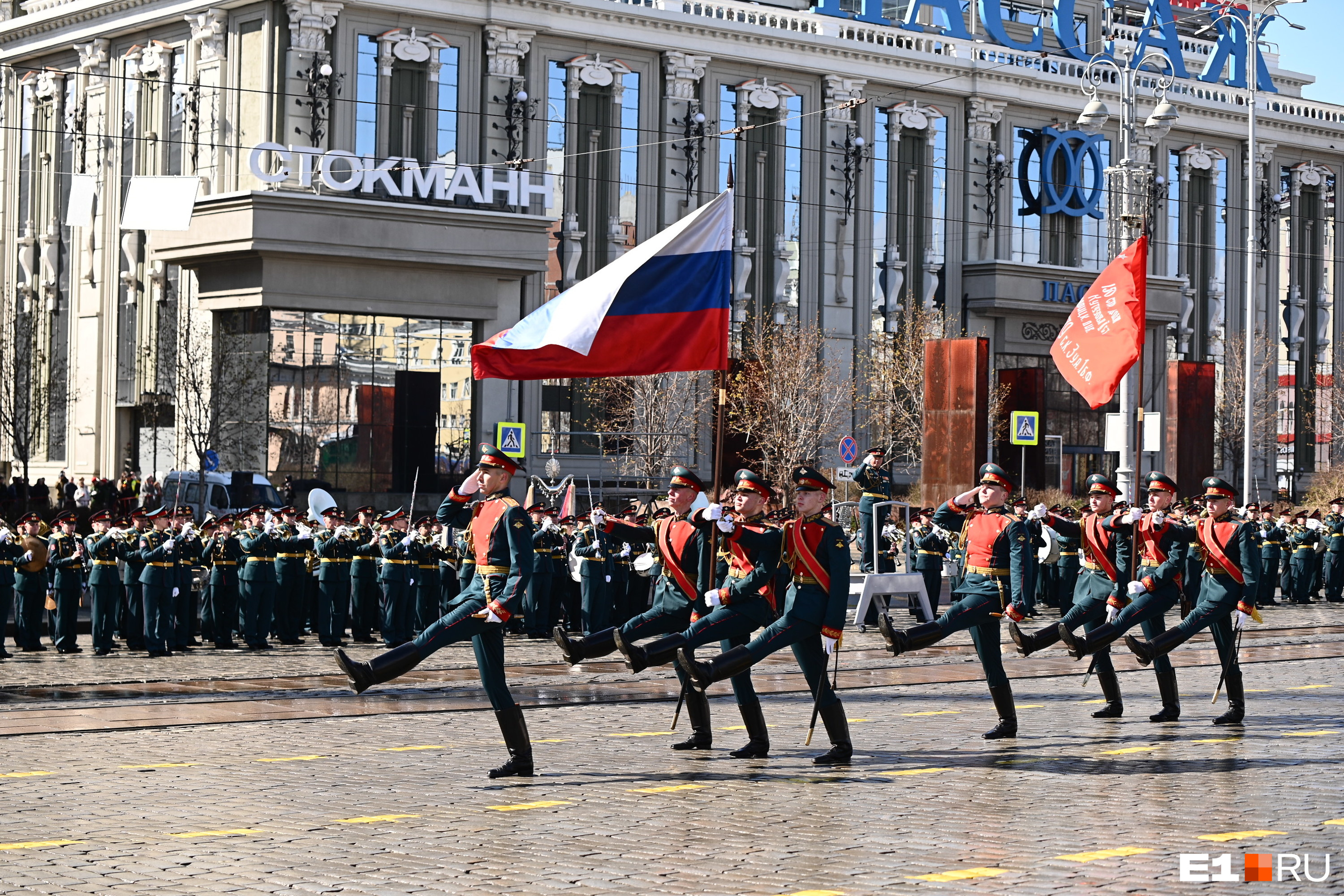В центре Екатеринбурга прозвучал гимн России, а с набережной у ДИВСа пушки запустили салют. На проспект Ленина вышли военнослужащие штаба Центрального военного округа, в том числе три женские коробки, военная полиция, сотрудники МЧС, Росгвардии, служащие ГУФСИН, юнармейцы.