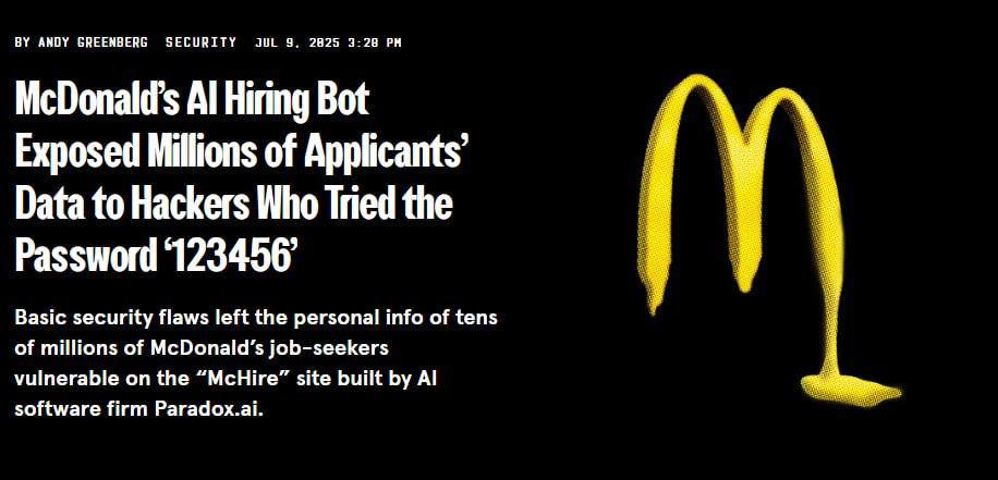 Хакеры взломали чат-бот Макдоналдса. Оказалось, что данные 64 млн соискателей работы были защищены паролем 123456.