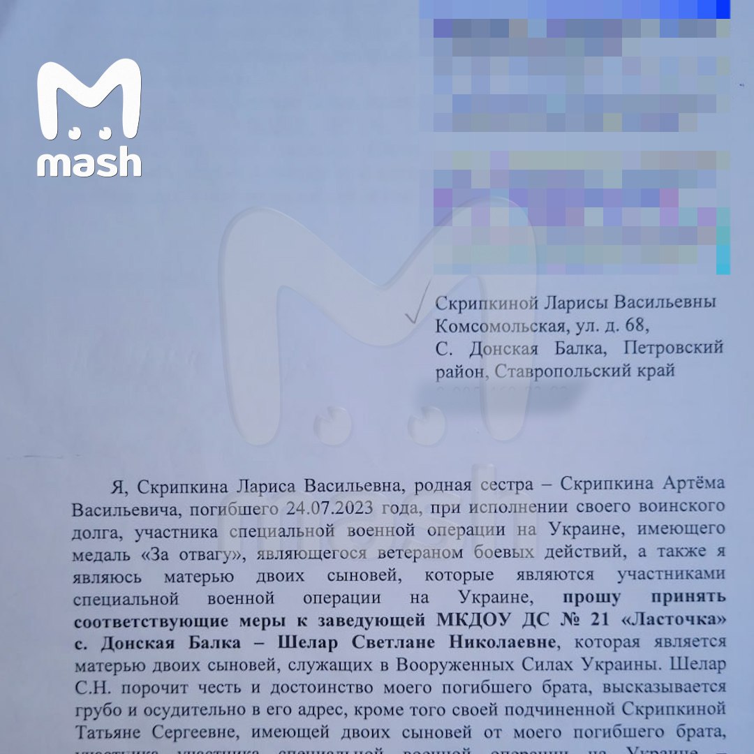 Заведующую детсадом в ставропольском селе Донская Балка коллективно обвинили в поддержке ВСУ. Заяву написали испуганные родители и часть педсостава — за проукраинскую позицию, угрозы детям и издевательства над родственниками погибших на СВО военнослужащих ВС РФ.