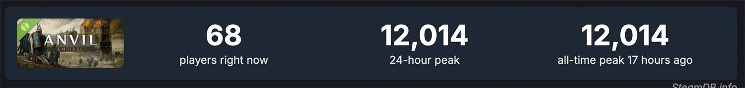 Согласно данным Steam DB, первый стресс-тест Anvil Empires привлек более 12 000 одновременных игроков – это больше, чем максимальное количество одновременных игроков Foxhole за всю историю игры. Так что интерес к новому тайтлу определенно есть.