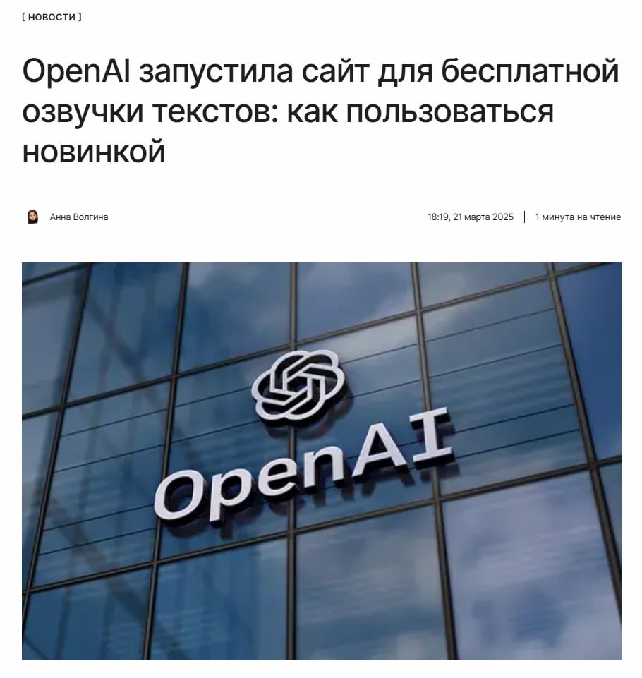 OpenAI запустила сайт для озвучки текстов на базе новых моделей, в основе которых лежит GPT-4o. Он доступен на 100 языках, в том числе на русском.