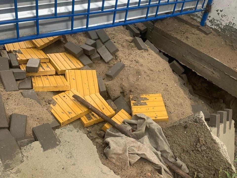На фото видны фрагменты набережной и проваливающийся вниз тротуар