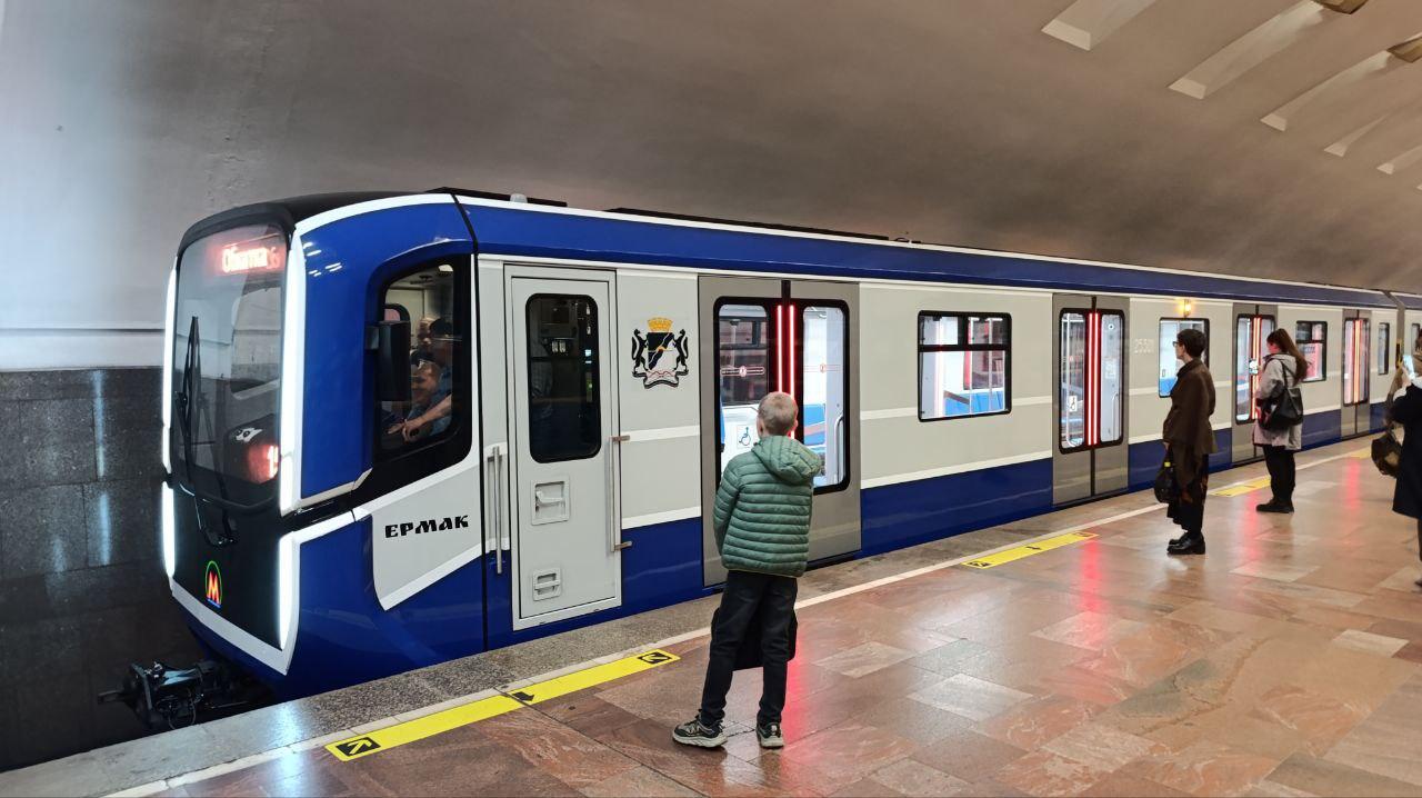 Пятивагонный состав «Ермак» курсирует в новосибирском метрополитене. Поезд проходит обкатку в рабочее время, его заметили на станции «Площадь Ленина» днем 17 сентября.