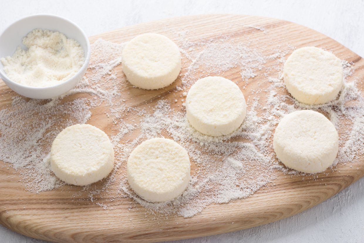 Для сырников используйте свежий творог 5-процентной или 9-процентной жирности, в идеале — фермерский. Если продукт влажный, его нужно достать из упаковки и немного подсушить перед приготовлением.