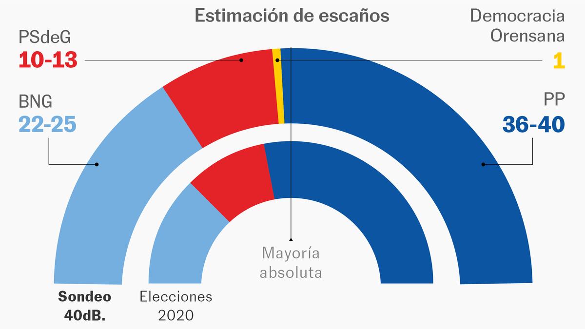 Con la campaña a pleno rendimiento, el clima político en Galicia ya no es el mismo que hace un mes. A comienzos de enero, 40dB. sondeó por primera vez las expectativas ante el 18-F y sus resultados apuntaban a una resistente mayoría del PP, que se mostraba en condiciones de repetir su arrasadora victoria de 2020, cuando Alberto Núñez Feijóo logró 42 de los 75 escaños del Parlamento autónomo. Desde entonces, los populares han cedido dos puntos en intención de voto y con el 45,2% ya no tienen segura la mayoría de 38 diputados necesaria para garantizar su continuidad en la Xunta. Todo depende de las oscilaciones de una pequeña cantidad de sufragios y del reparto provincial. El sondeo coloca al PP en una horquilla entre 36 y 40 asientos en el Parlamento, con una mediana justo en la cifra fronteriza de los 38. En la hipótesis peor para Rueda, la alianza entre nacionalistas y socialistas ―con años de experiencia de gobiernos conjuntos en diputaciones y ayuntamientos― sumaría los apoyos para hacerse con el Gobierno de la Xunta. El trabajo de 40dB. se desarrolló entre los días 2 y 7, con lo que recogió el efecto del único debate entre candidatos.