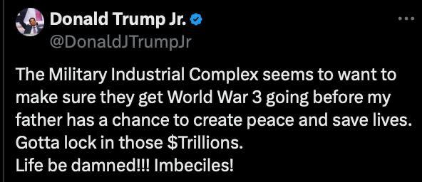 "Военно-промышленный комплекс, похоже, хочет быть уверенным, что начнется Третья мировая война, прежде чем у моего отца появится шанс принести мир и спасти жизни. Надо обеспечить себе триллионные доходы. Жизни никого не волнуют! Имбецилы!", - сказал Трамп-младший.