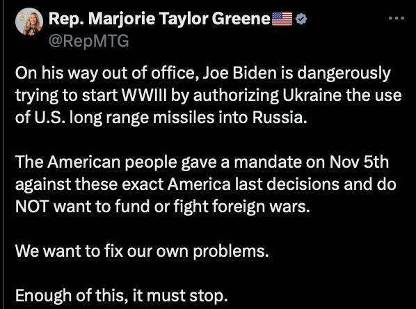 Конгрессвумен Марджори Тейлор Грин также обвинила Байдена в попытке развязать Третью мировую.