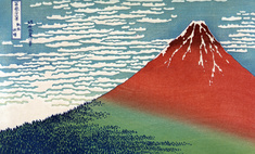 1. Красный. «Красная Фудзи» — это редкое явление, которое можно наблюдать в окрестностях горы в определенный момент. В конце лета или начале осени при хорошей погоде и южном ветре рассветные лучи солнца красят склон Фудзиямы в алый. Таким образом, на гравюре показано пограничное время — между ночью и днем, между двумя сезонами.
