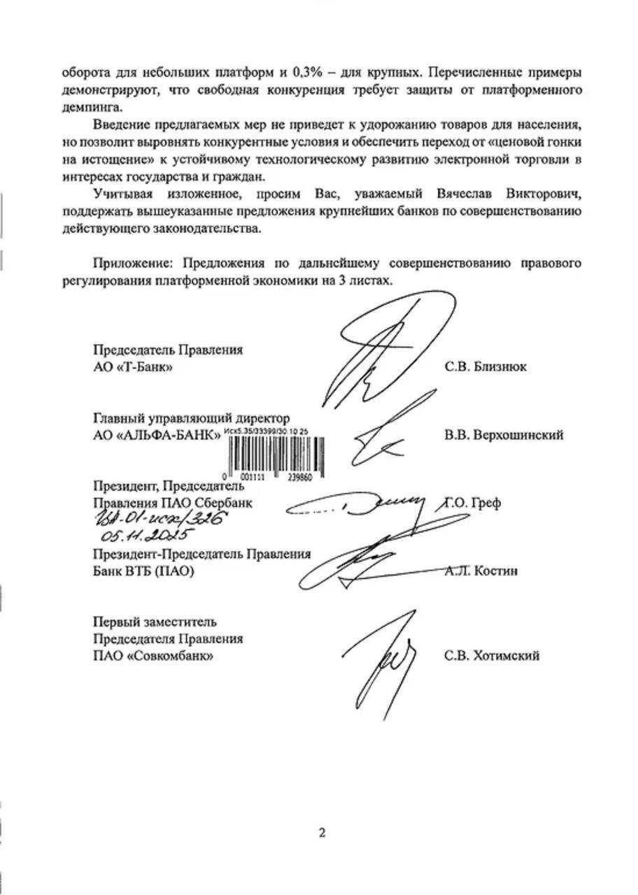 Свои подписи под документом поставили главы Сбера, ВТБ, Т-Банка, Альфы и Совка. @banki_economy
