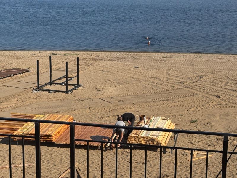 Женщины наслаждались отдыхом. В тот момент, когда строительные бригады собирают настилы на пляже, сызранки спокойно плавали. Горожане удивляют - их не пугает даже то, что они находятся на строительной площадке.