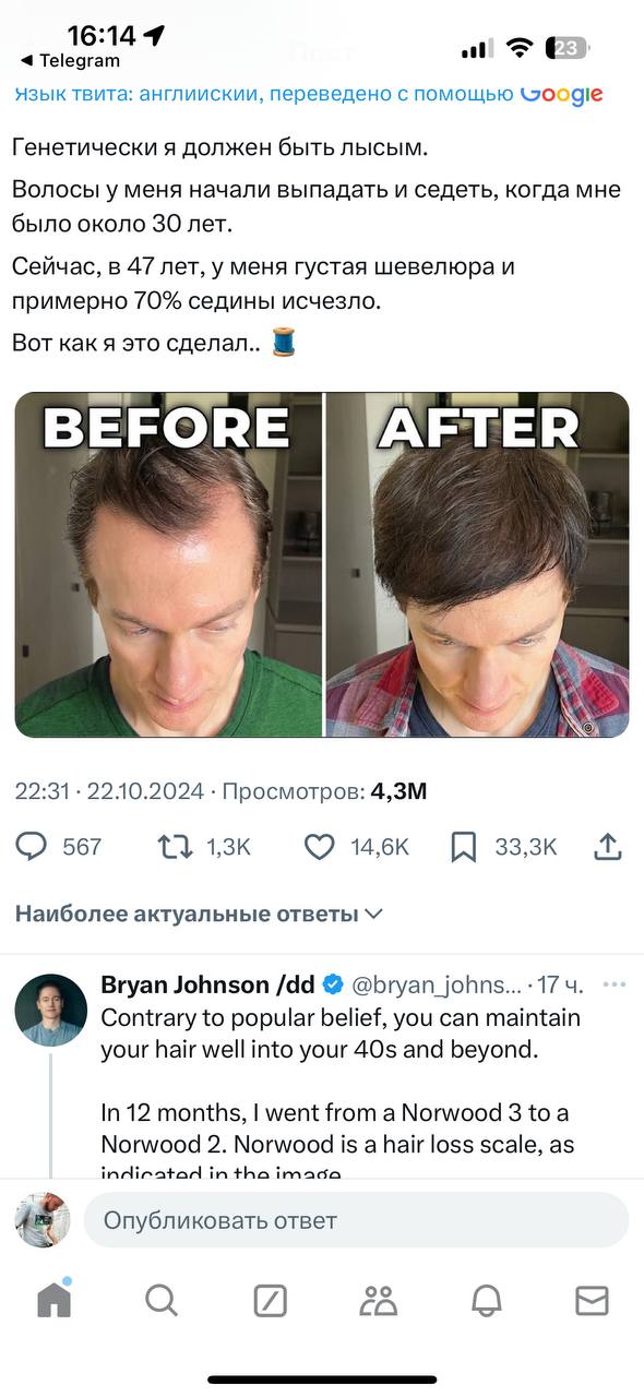 Лысеющие скуфы, внимание: знаменитый биохакер Брайан Джонсон написал подробный гайд о том, как восстановить волосы без пересадки