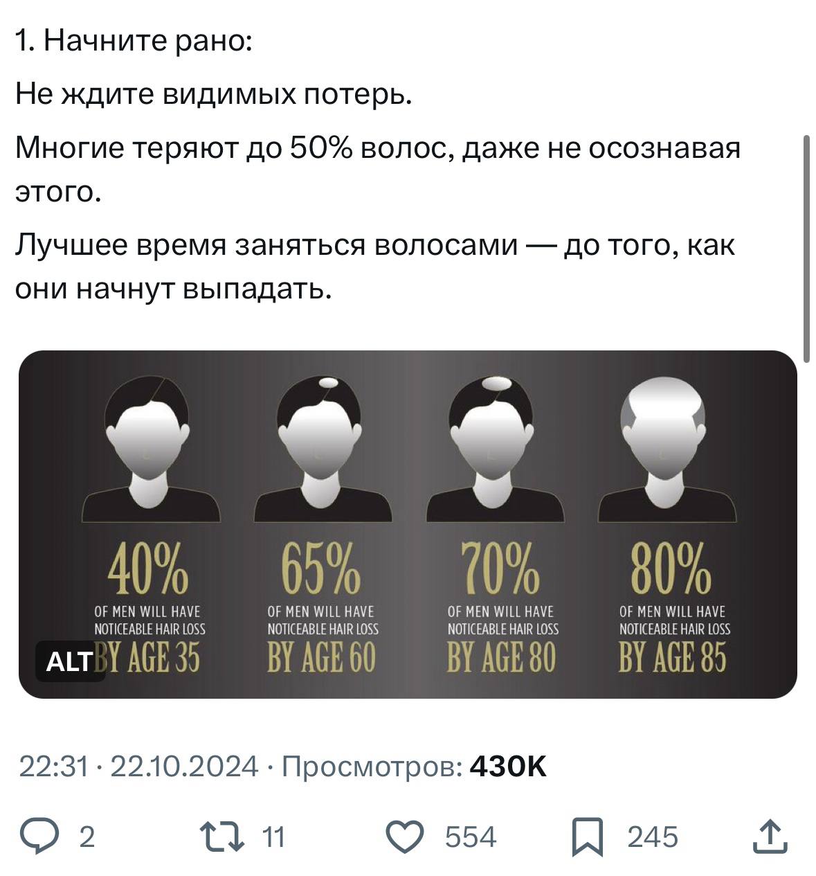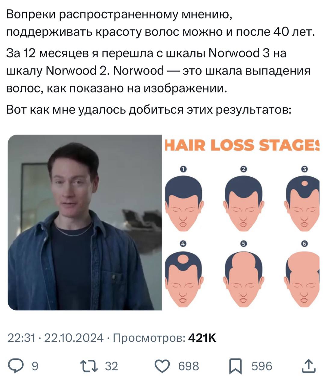 Он смог вернуть 70% утраченных волос, несмотря на генетическую предрасположенность к облысению. В гайде он поделился важнейшими советами: какие витамины нужно принимать, какие процедуры стоит проводить, а также дал рекомендации по питанию.