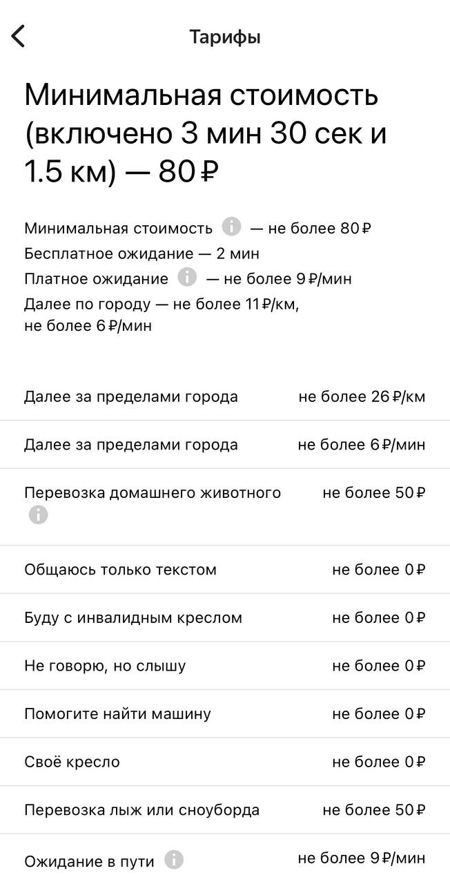 Условия для каждого тарифа такси фиксированы. В самом популярном у пользователей «Экономе» минимальная стоимость поездки составляет 80 рублей, в эту сумму входят 3,5 минуты и 1,5 километра. Всё, что вы проедете сверх этого, оплачивается дополнительно. Минута по городу стоит шесть рублей, и километр — 11 рублей.