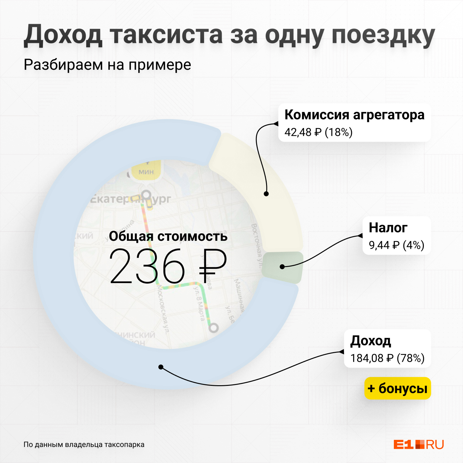 Не стоит думать, что таксисты из «Эконома» в часы пик с такими поездками зарабатывают по тысяче рублей в час. Солидную часть их дохода отбирают агрегаторы и государство. Руководитель таксопарка Yoko Александр Ремезов пояснил E1.RU, что из стоимости заказа вычитается комиссия «Яндекса», и чем дороже заказ, тем больше комиссия. В Екатеринбурге она составляет примерно 18%.
