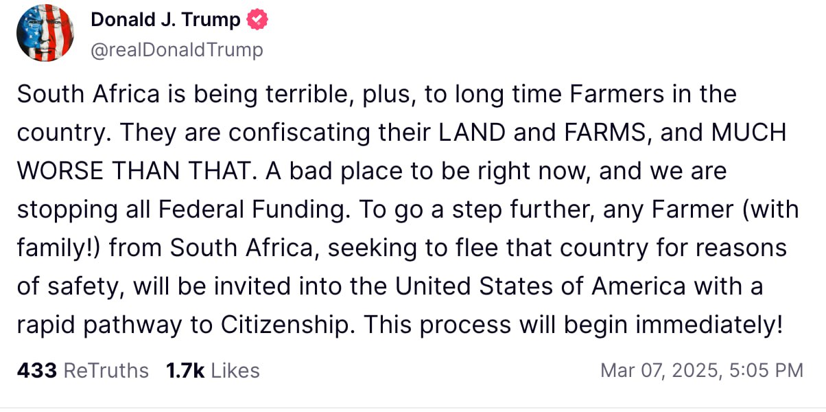 «Южная Африка ведёт себя ужасно, особенно по отношению к фермерам, которые долгое время работают в стране. У них конфискуют землю и фермы, и происходит нечто гораздо худшее. Сейчас это плохое место для жизни, и мы прекращаем всё федеральное финансирование.