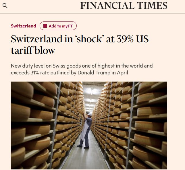 Швейцария «в шоке» от решения Трампа ввести 39% пошлину на швейцарский экспорт, — FT со ссылкой на источники