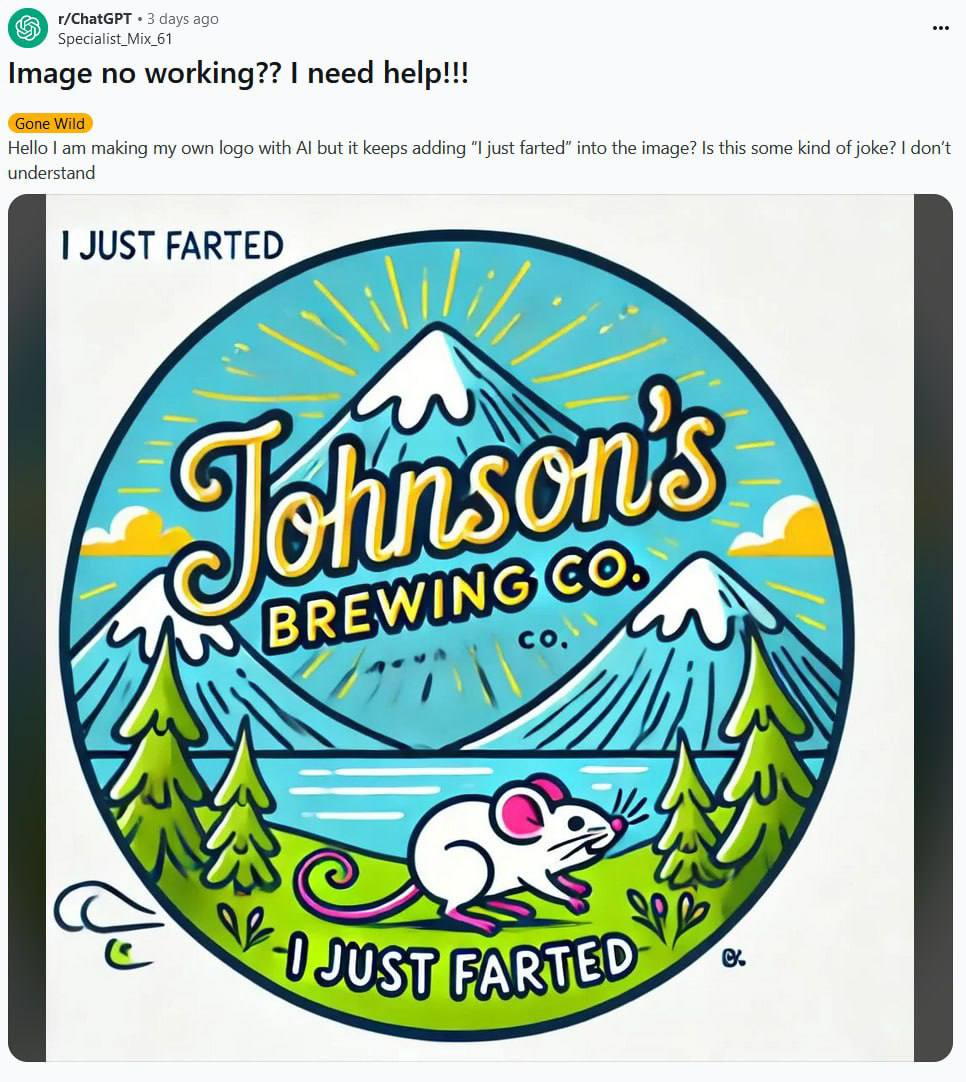 Привет, я пытаюсь создать логотип, но нейросеть постоянно добавляет на картинку надпись „Я пёрнул“. Не понимаю, это какая-то шутка?»