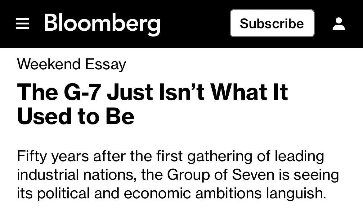 🔹На данный момент доля G7 в мировой экономике рухнула ниже 30%. Страны группы представляют менее 10% мирового населения. Утрата влияния на лидеров России и США положила конец политическим и экономическим устремлениям G7