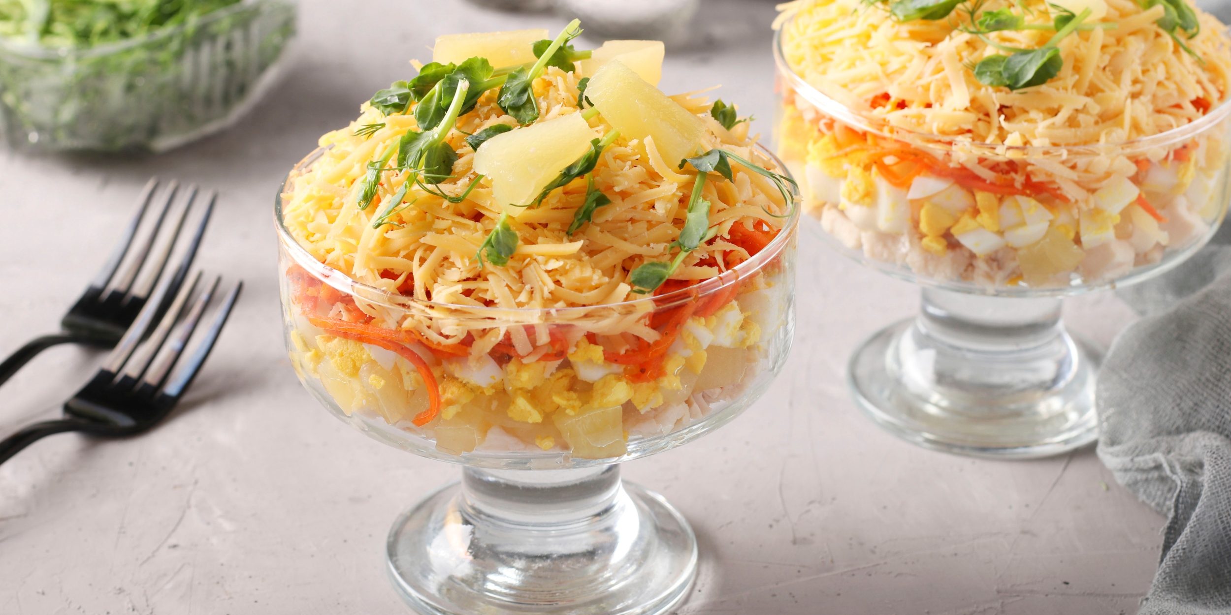 7. Слоёный салат с ананасом, курицей, сыром, яйцами и грецкими орехами