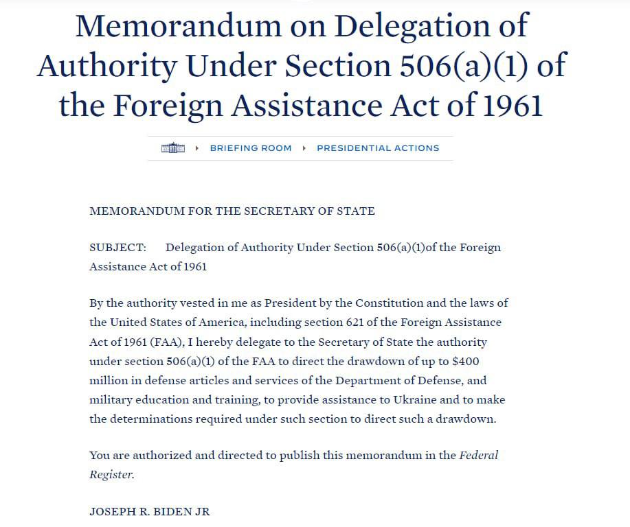 ⚡️США официально объявили о выделении Украине пакета военной помощи на 400 млн долларов.