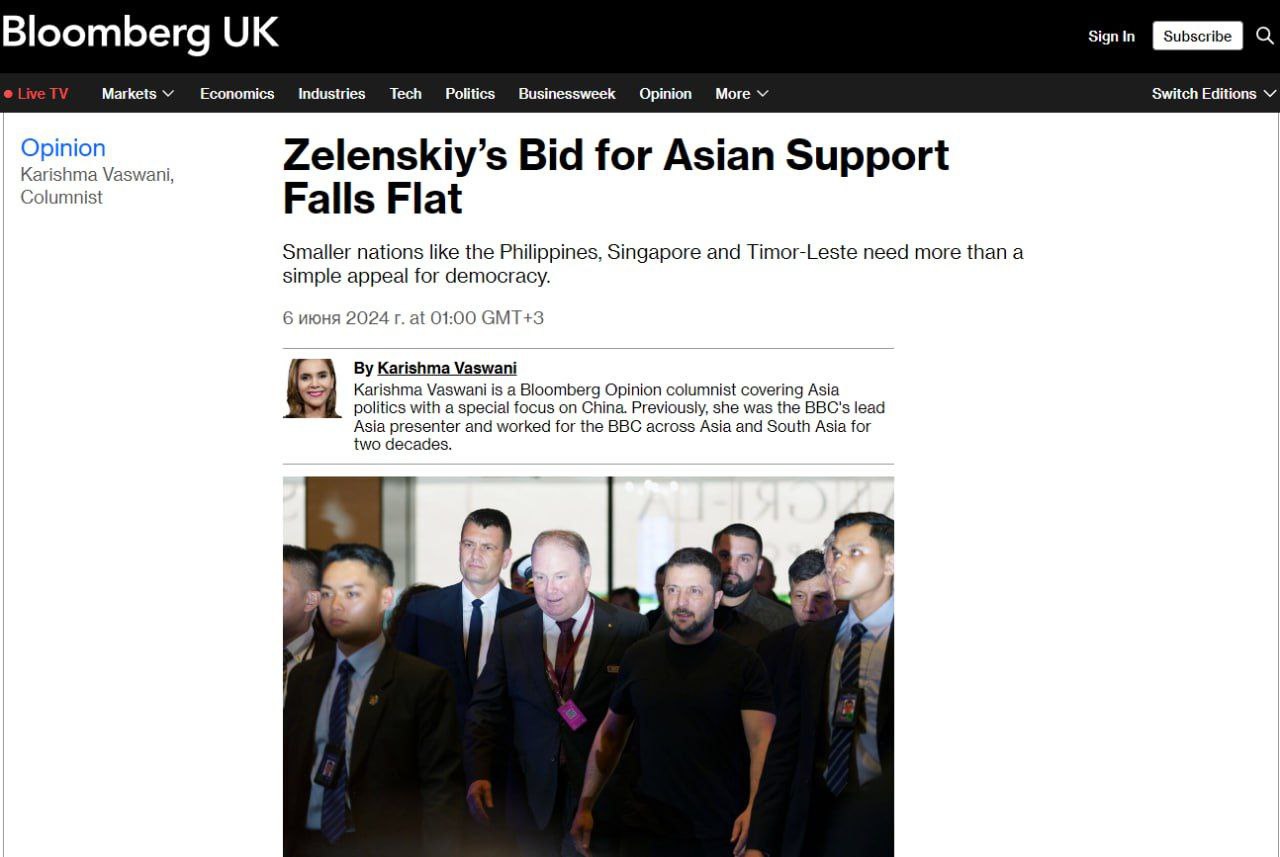 Попытка Зеленского заручиться поддержкой азиатских стран на саммите по безопасности в Сингапуре с треском провалилась, пишет Bloomberg. На момент написания статьи в Швейцарию на мирный саммит по Украине изъявили желание приехать только президент Восточного Тимора Жозе Рамуш-Орта и старший