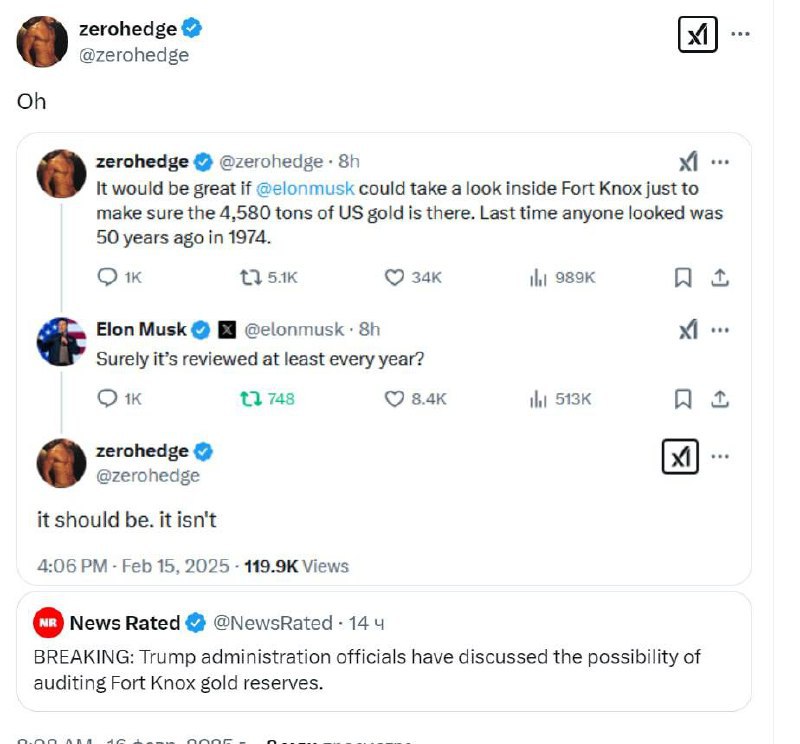 Республиканцы давно хотели устроить аудит золотых запасов. А сейчас ещё во всём мире бушует золотая лихорадка, которая привела ко взлёту стоимости тройской унции до рекордных 3,000 долларов. Спрос на золото находится на рекордно высоком уровне на фоне торговых войн и нестабильности. Золото воспринимают альтернативу доллару и казначейским бумагам США.