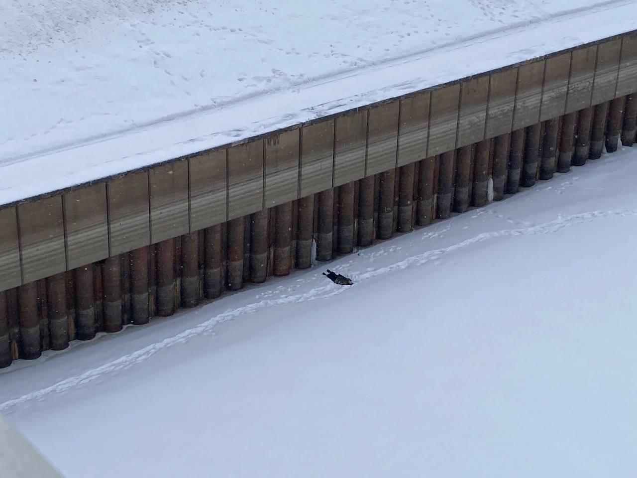 Судя по всему, пожилой мужчина упал с парапета на лед спиной вниз. Как это произошло, пока неизвестно. Судя по следам, погибший некоторое время гулял по ограждению.