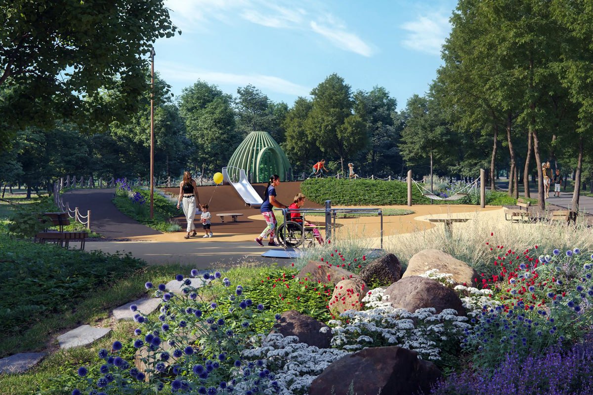 Там появятся детские площадки, в том числе и доступная детям с инвалидностью. Будут созданы возможности для занятий спортом: в сквере поставят уличные тренажёры и игровой комплекс. Для любителей спокойного отдыха поставят скамейки в тихих уголках парка.