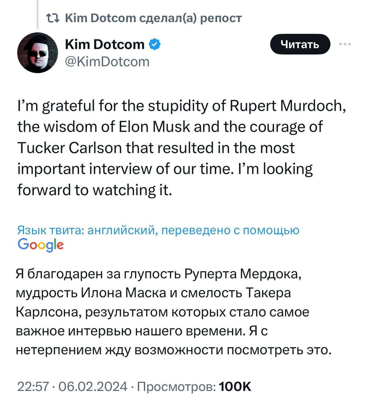 ❗️Ким Дотком объясняет почему все сошли с ума из-за анонса интервью Такера Карлсона с Владимиром Путиным.