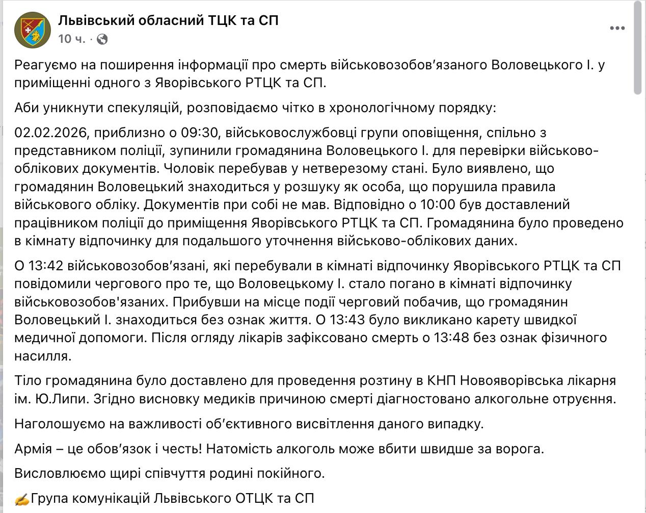 Львовский областной ТЦК заявил, что мужчина на момент задержания был пьян, обновленных военных документов не имел. Его отвезли в (!) «комнату отдыха» в ТЦК к другим мобилизованным. Те вскоре заявили дежурному, что мужчине стало плохо. Он был без признаков жизни, а врачи уже через 5 минут после первого обращения зафиксировали смерть.