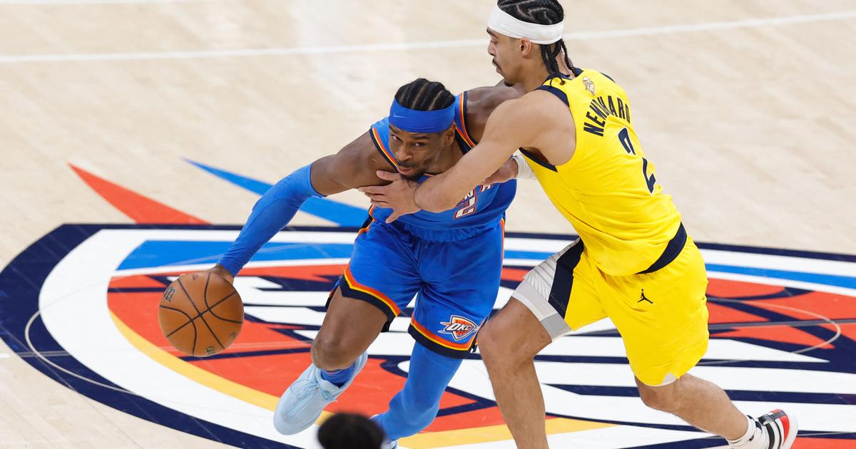 Avec les têtes sans doute lourdes, les Pacers repartaient au combat (25-26, puis 27-28), ils s’accrochaient (32-32). Et ils avaient bien raison, sachant que le Thunder n’était pas en place (37-32, puis 42-45). Depuis la blessure d’Haliburton, le match avait clairement changé de visage. Un 5-0 d’OKC pour reprendre les commandes dans la dernière minute de la première période (47-45), avant l’énorme triple de Nembhard (47-48 MT). Fou. Petit score, petits pourcentages (40,5% contre 42,1), tout à faire. 16 points et 7 passes pour Shai Gilgeous-Alexander. On avait appris, au cours du deuxième quart, qu’Haliburton ne reviendrait pas et qu’il était touché au tendon d’Achille.