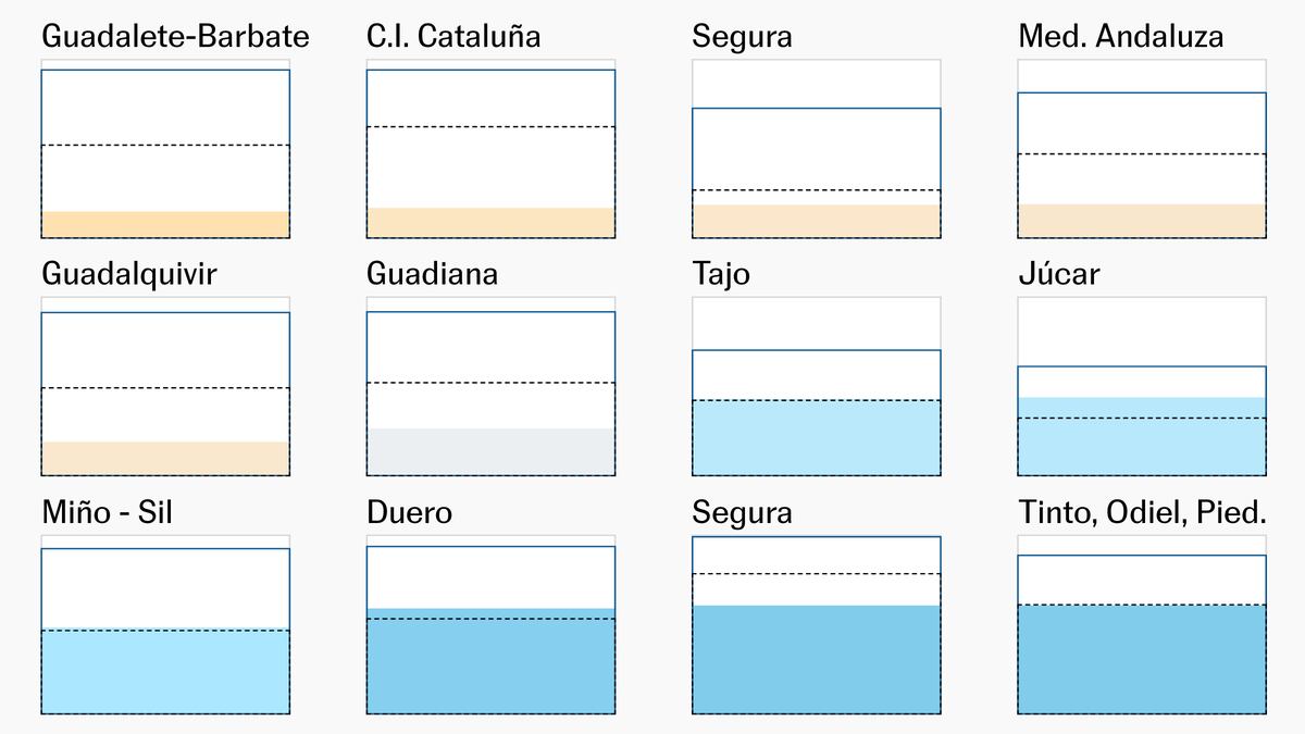 Los lugares con menos reservas esta semana son las cuencas de Guadalete-Barbate y las internas de Cataluña. En el cartograma se muestran todas, con el nivel actual, su media histórica y su máximo.
