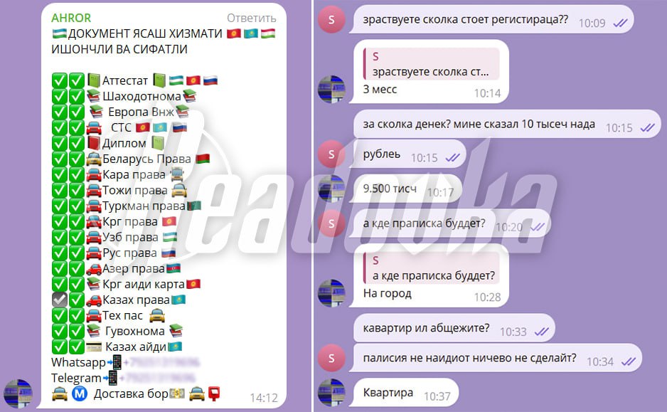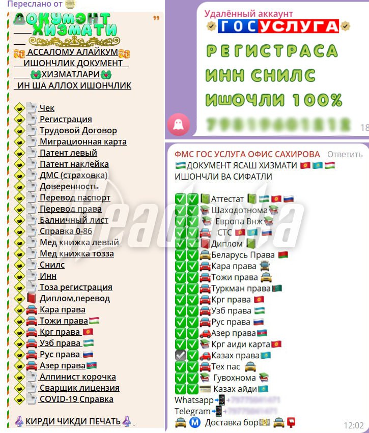 ▪️В чатах на узбекском, киргизском и таджикском языках боты, называющие себя «ФМС», обещают клиентам любую липу — от дипломов до вида на жительство. Даже без миграционного паспорта и с признанием в нарушении закона оформляют «регистрацию через Госуслуги». Как — не объясняют.